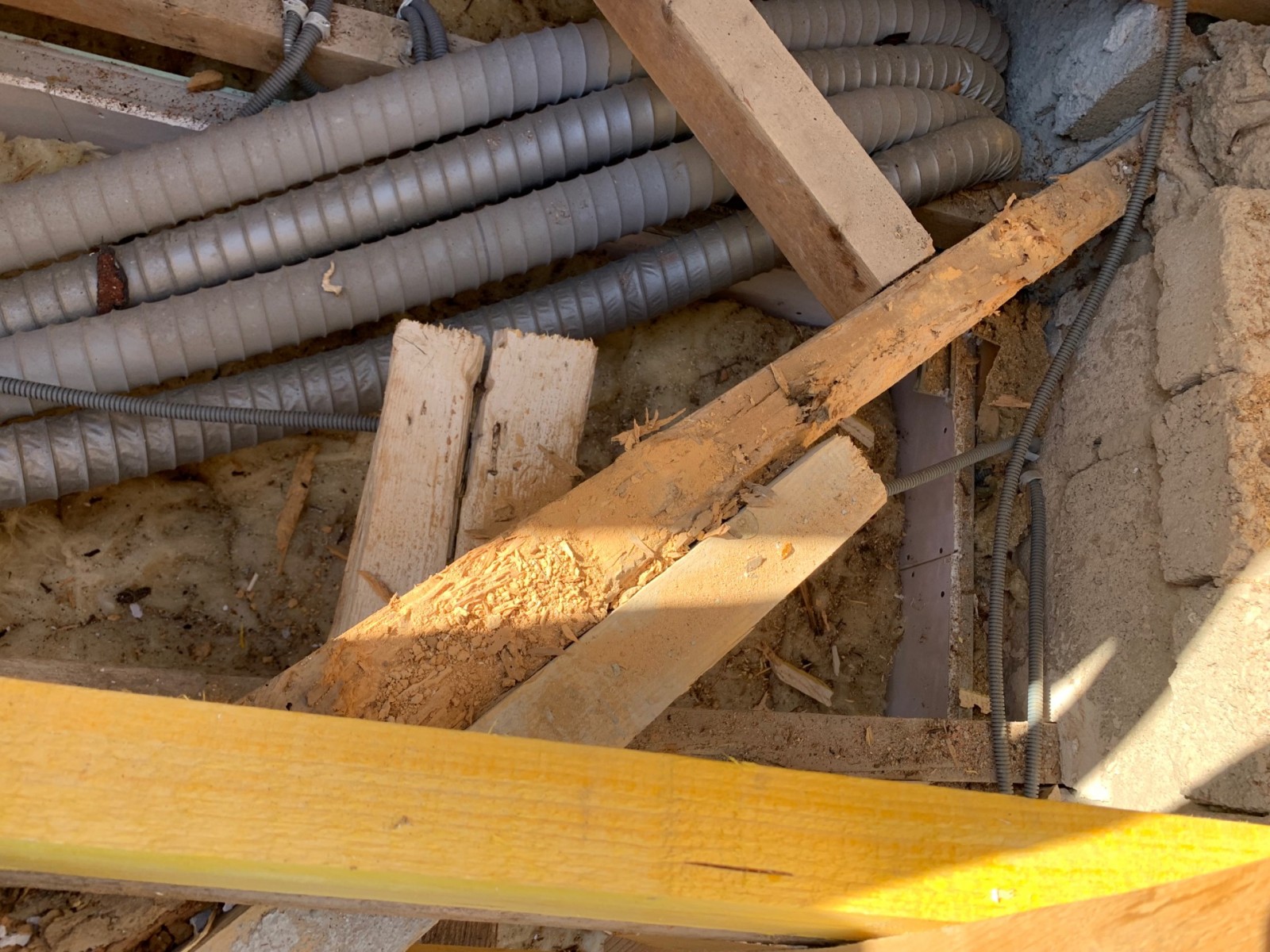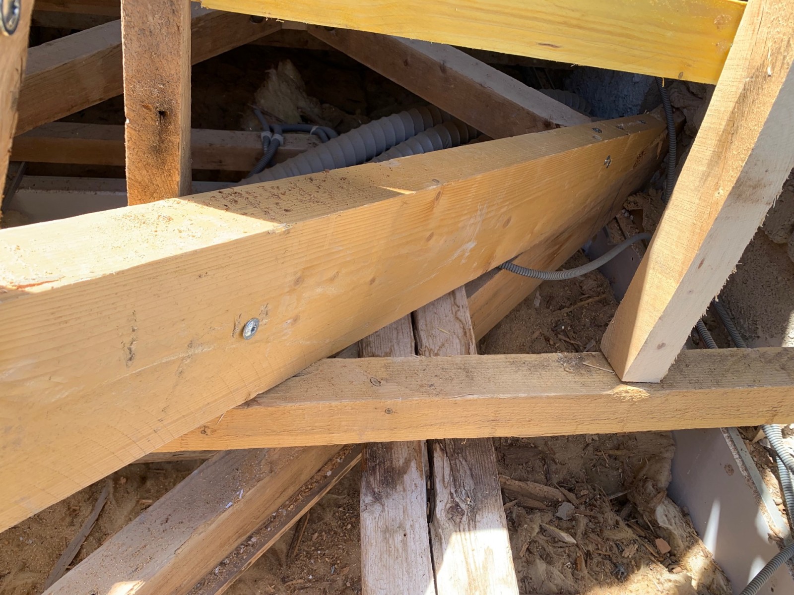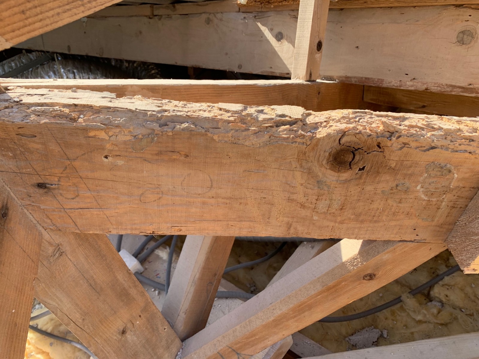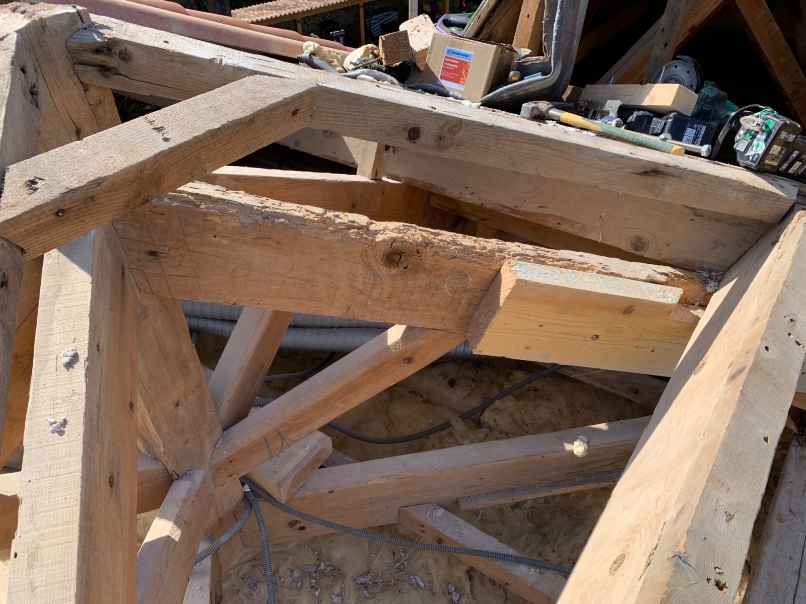 Après un accès dans les combles par la trappe, nous avons pu constater qu’une attaque de capricorne était en cour sur des pièces de bois maîtresse de la charpente au niveau des arbalétrier, jambes de force et du poinçon