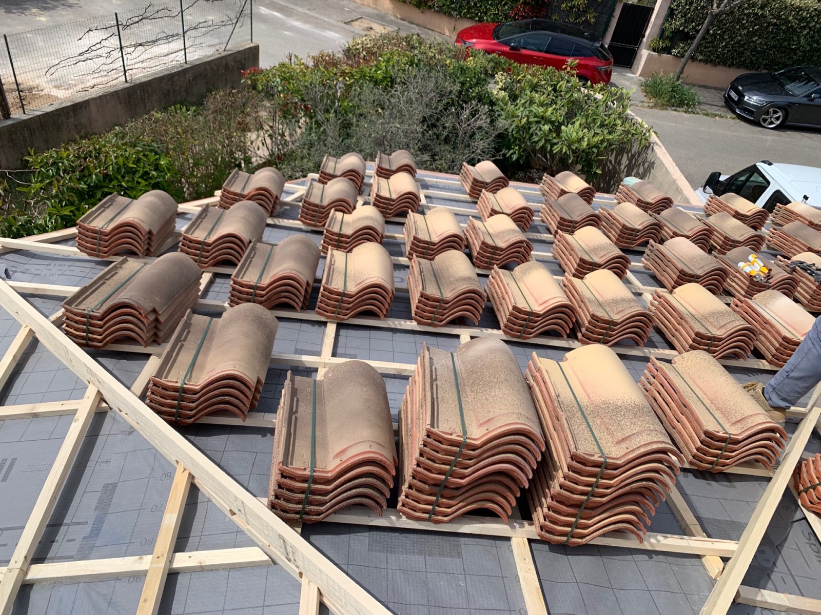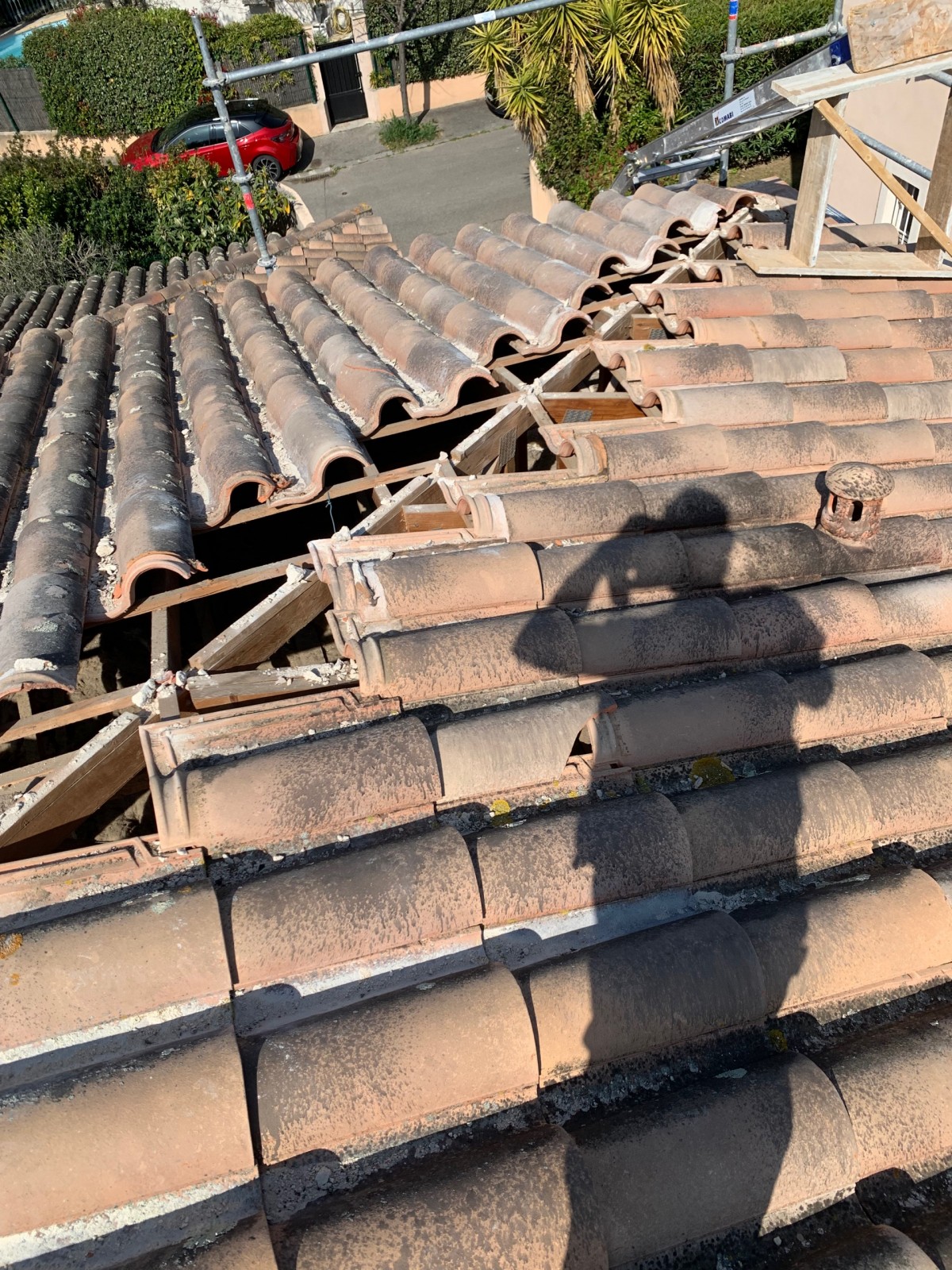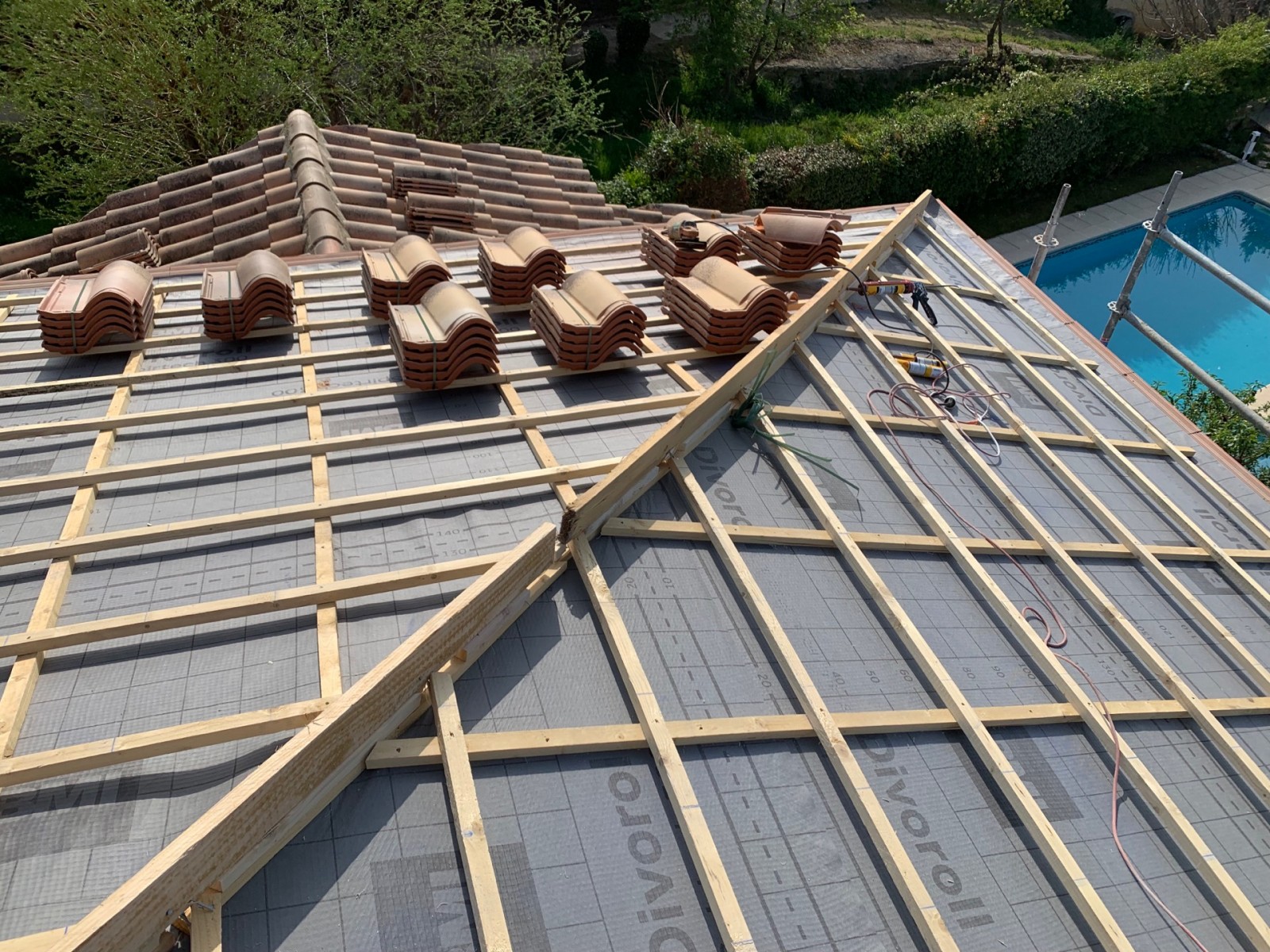 Nous avons Commencer par effectuer la dépose toute la toiture tuile, déposer tous les faîtages et les arêtiers, déposer tous les Liteau, conserver la charpente en fermette, installer un écran sur toiture R3, Poser un contre lattage, poser le liteaunnage en 27x40mm puis installer de la tuile plein Sud couleur emporda, avec la pose de closoir ventilé métal roll et des tuiles canal pour former les arrêtiez et faîtage