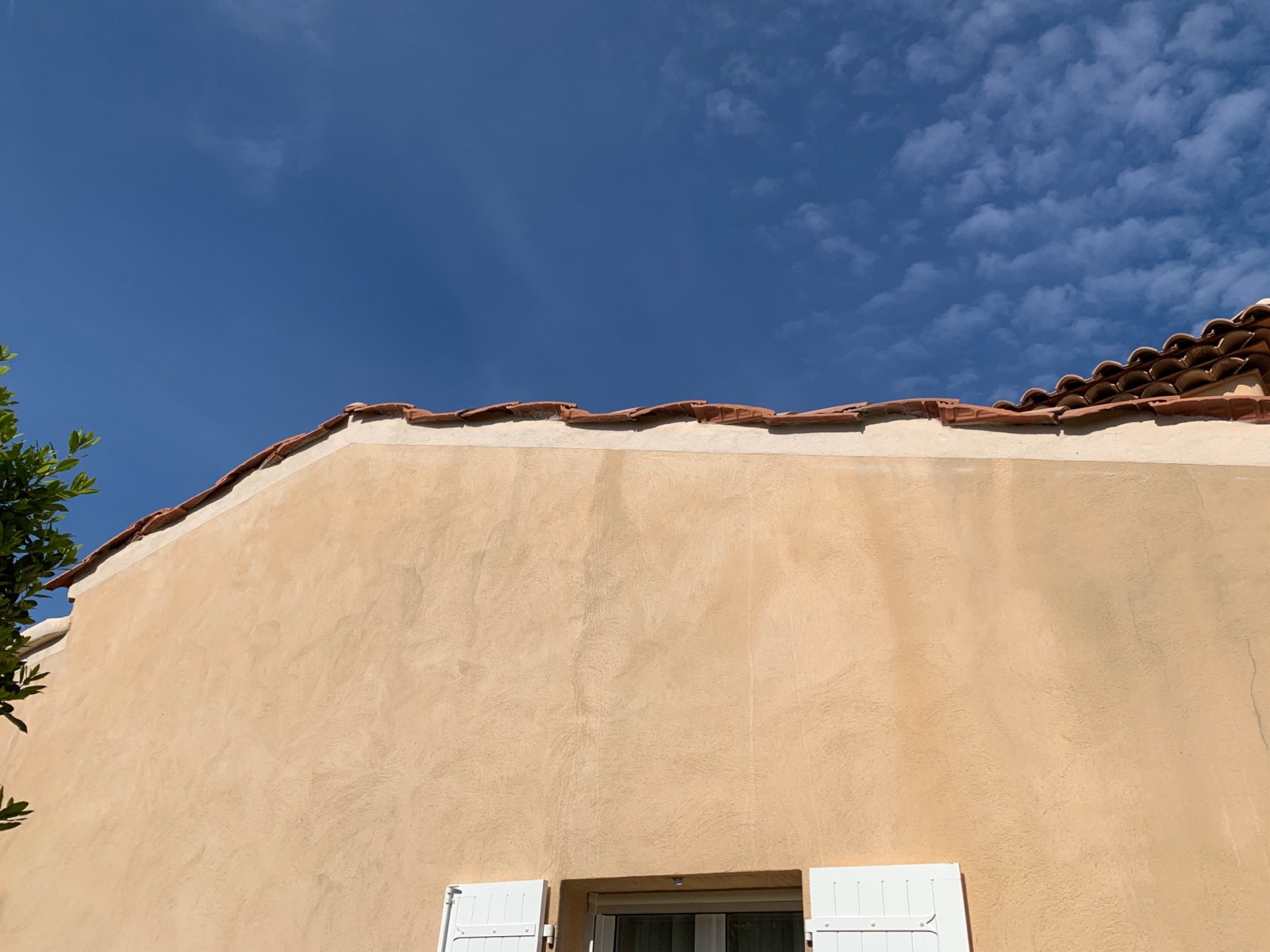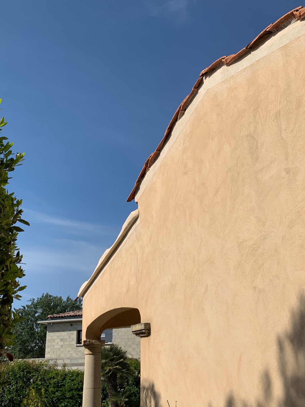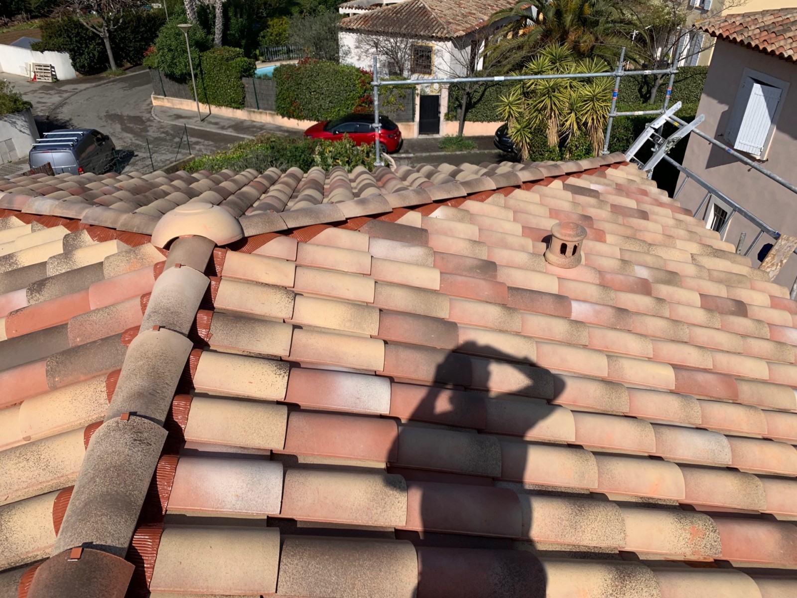 Nous avons Commencer par effectuer la dépose toute la toiture tuile, déposer tous les faîtages et les arêtiers, déposer tous les Liteau, conserver la charpente en fermette, installer un écran sur toiture R3, Poser un contre lattage, poser le liteaunnage en 27x40mm puis installer de la tuile plein Sud couleur emporda, avec la pose de closoir ventilé métal roll et des tuiles canal pour former les arrêtiez et faîtage