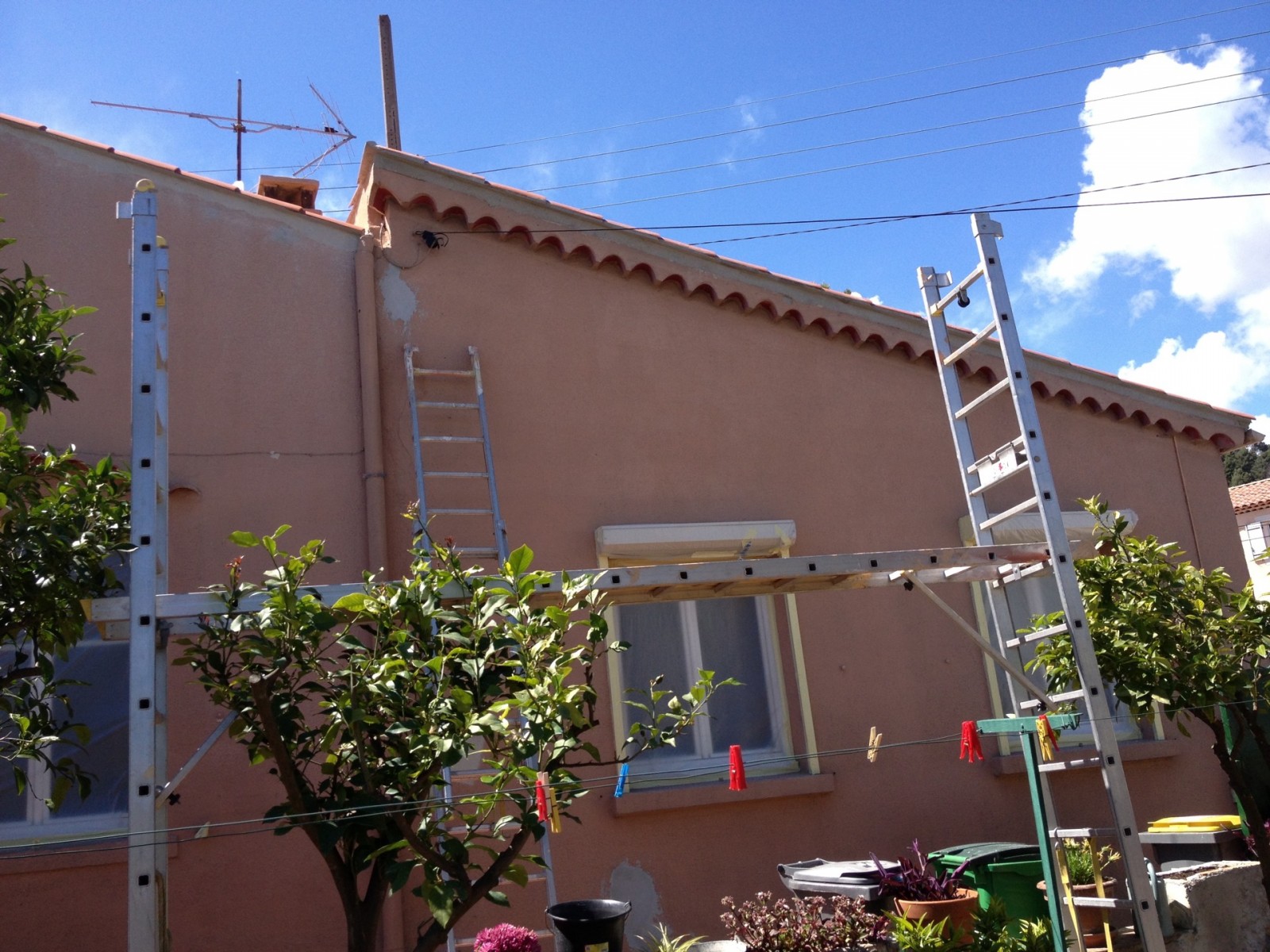 Nous avons donc procéder à un nettoyage minutieux au Karcher à eau froide puis à une reprise de toutes les parties d’enduit et de crépi qui ne tenait plus ensuite nous avons appliquer une sous-couche de peinture des entreprises Tollens pour renforcer l’accroche puis avont appliquer deux couches de peinture semi épaisse Renocryl 500