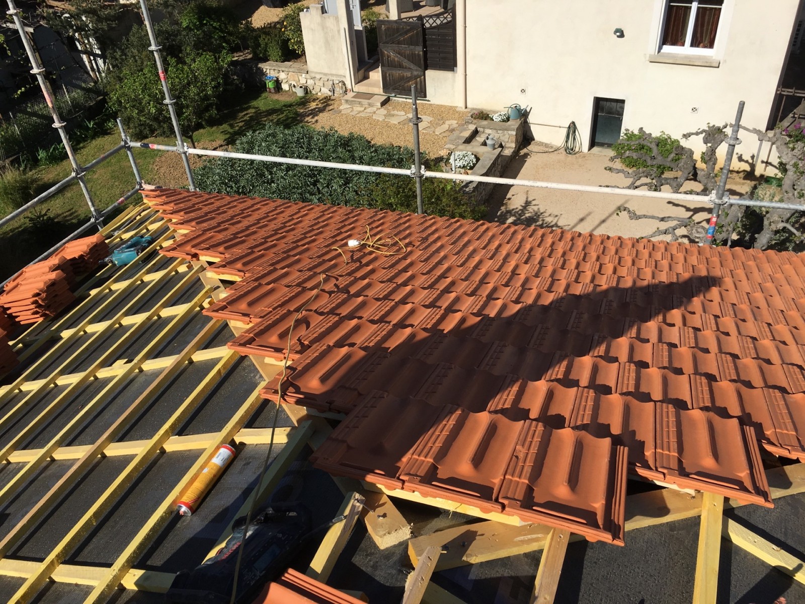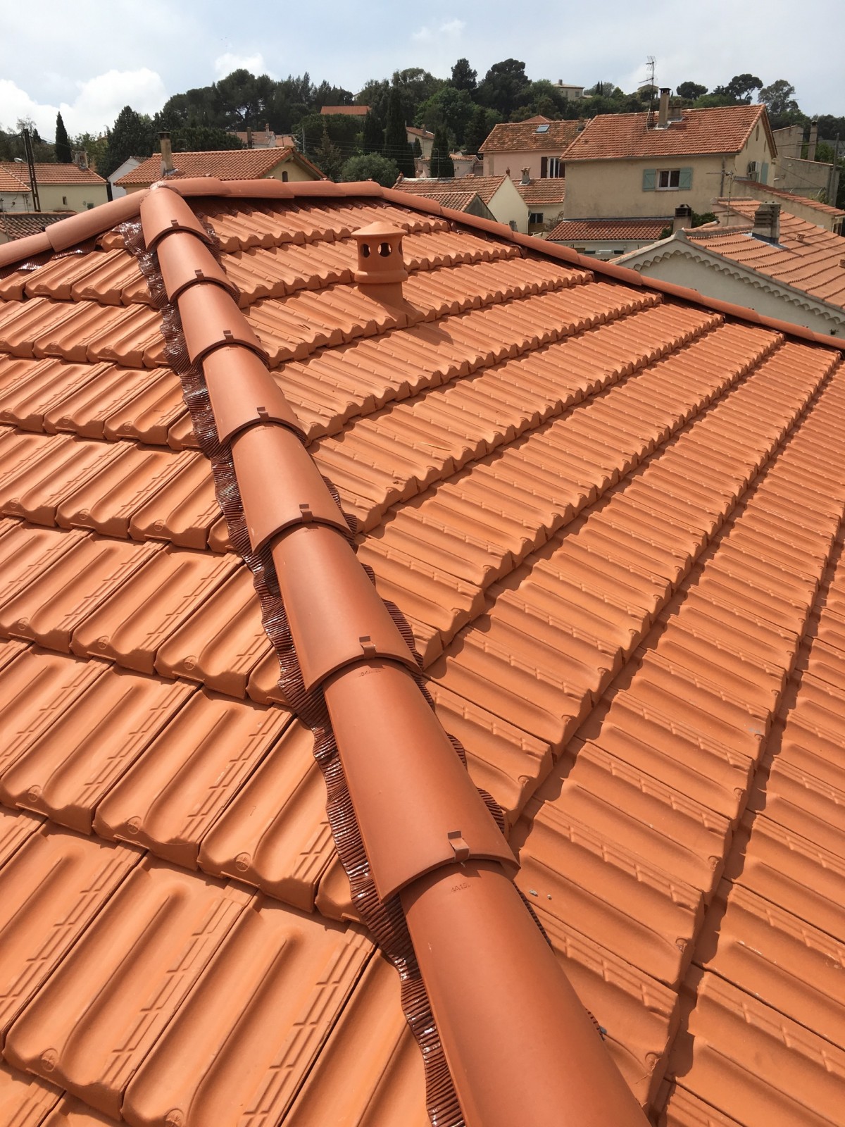 Toutes les tuiles ont été posées sur les liteaux puis collées une sur deux en quinconces et enfin nous avons installé tous les closoirs ventilé sur les arrêtiez et le faîtage puis posé toutes les tuiles canal pour fermer la toiture. Toutes les tuiles installées sont des tuiles plates de Marseille de première catégorie de chez Monnier.