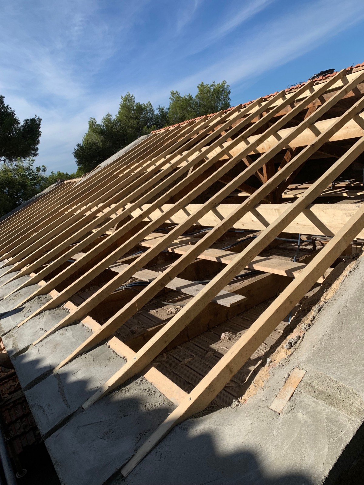 La dépose de toutes les tuiles plate de Marseille, la dépose de tous les liteaux, mais également la réfection des chevrons et des panne de la charpente qui été attaqué par les termites et les capricornes et aussi par de la fourmis charpentière.