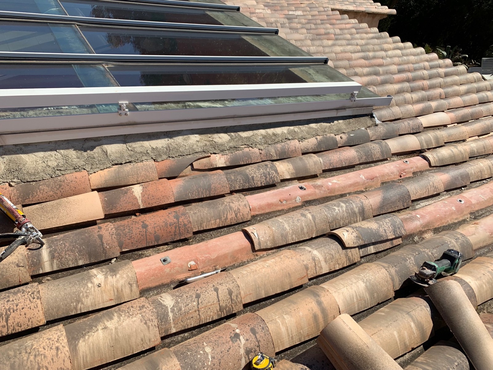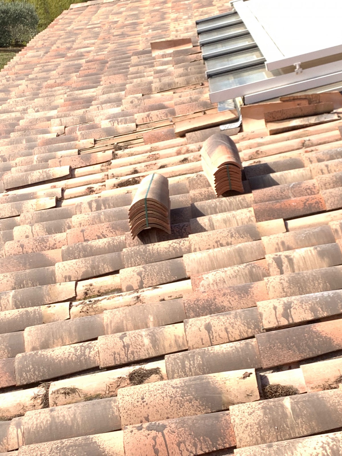 Notre cliente nous a contacter suite à un fort coup de vent et qu’elle a retrouver plein de ces tuiles canal, au sol après un contrôle approfondi de sa toiture nous avons constaté que 80% de ces tuiles n’était pas collée,